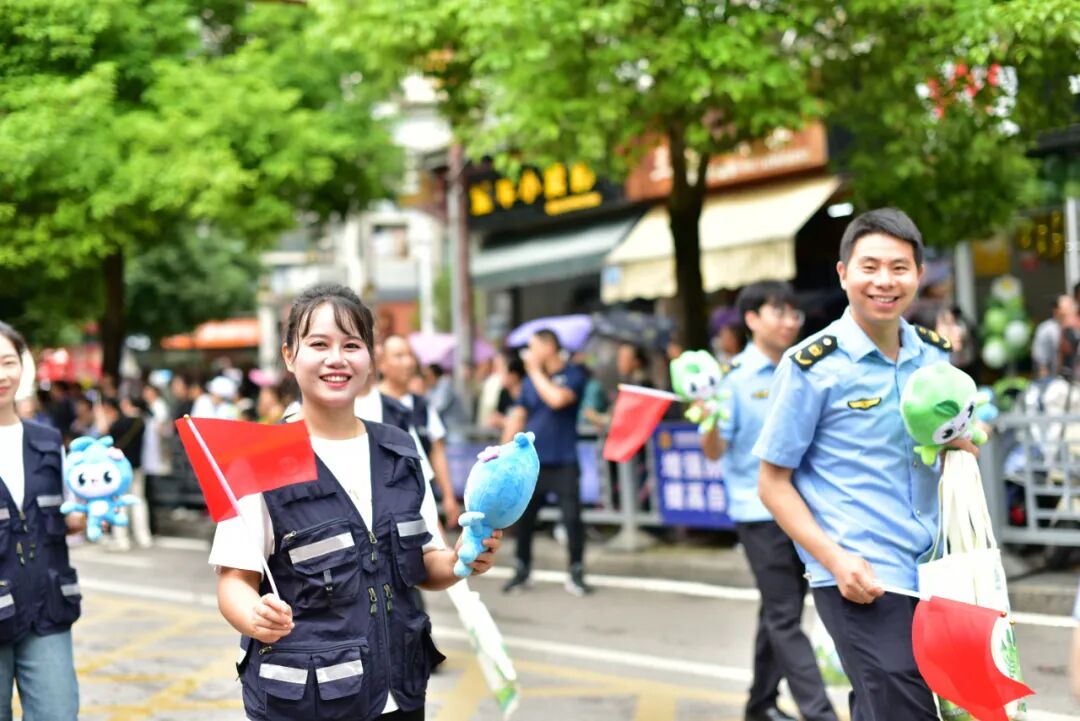 行进过程中,憨态可掬的“小山小水”生态环保卡通形象纪念品备受青睐。不少群众驻足赞叹:“这两个吉祥物太可爱了!绿水青山就是金山银山,保护生态环境确实人人有责!”