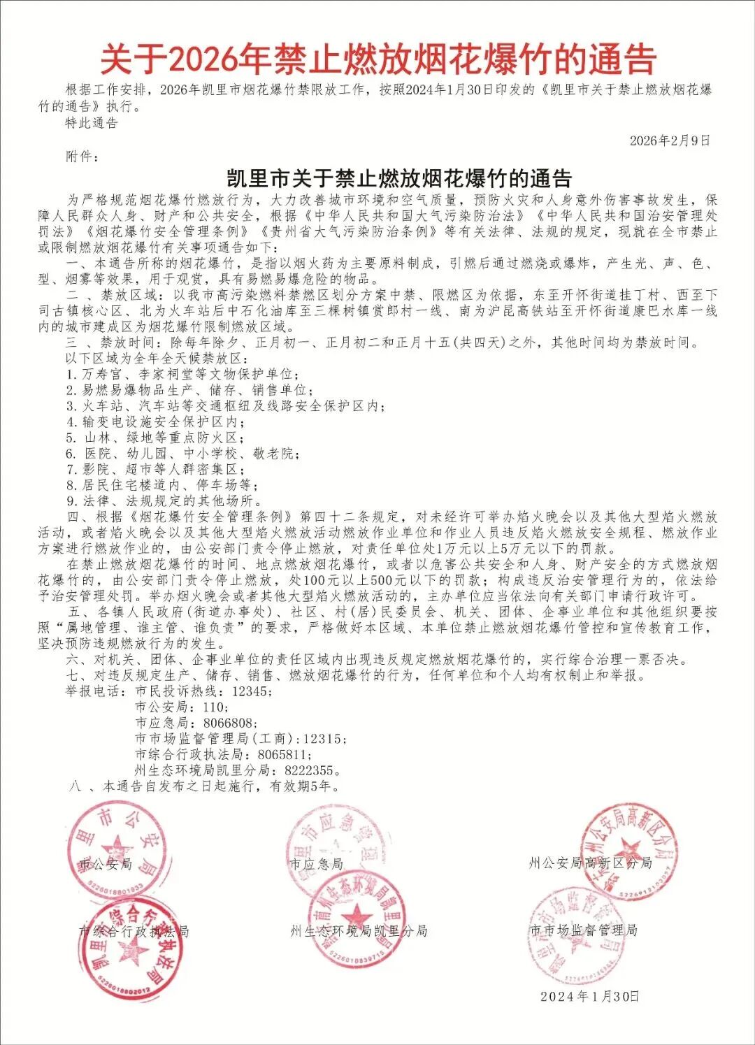 为严格规范烟花爆竹燃放行为,大力改善城市环境和空气质量,预防火灾和人身意外伤害事故发生,保障人民群众人身、财产和公共安全,根据《中华人民共和国大气污染防治法》《中华人民共和国治安管理处罚法》《烟花爆竹安全管理条例》《贵州省大气污染防治条例》等有关法律、法规的规定,现就在全市禁止或限制燃放烟花爆竹有关事项通告如下。