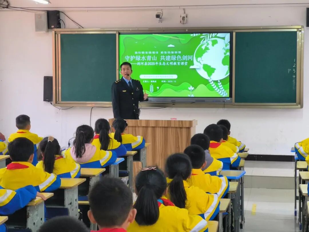 2025年,剑河县成功创建国家生态文明建设示范区,在全县掀起了总结宣传创建成果系列活动的热潮。为厚植生态文明理念,涵养青少年环保情怀,12月25日,黔东南州生态环境局剑河分局走进城关第一小学,开展以“守护绿水青山,共建绿色剑河”为主题的宣讲活动,以生动鲜活的生态文明课堂为孩子们播撒绿色希望,凝聚守护家园的青春力量。